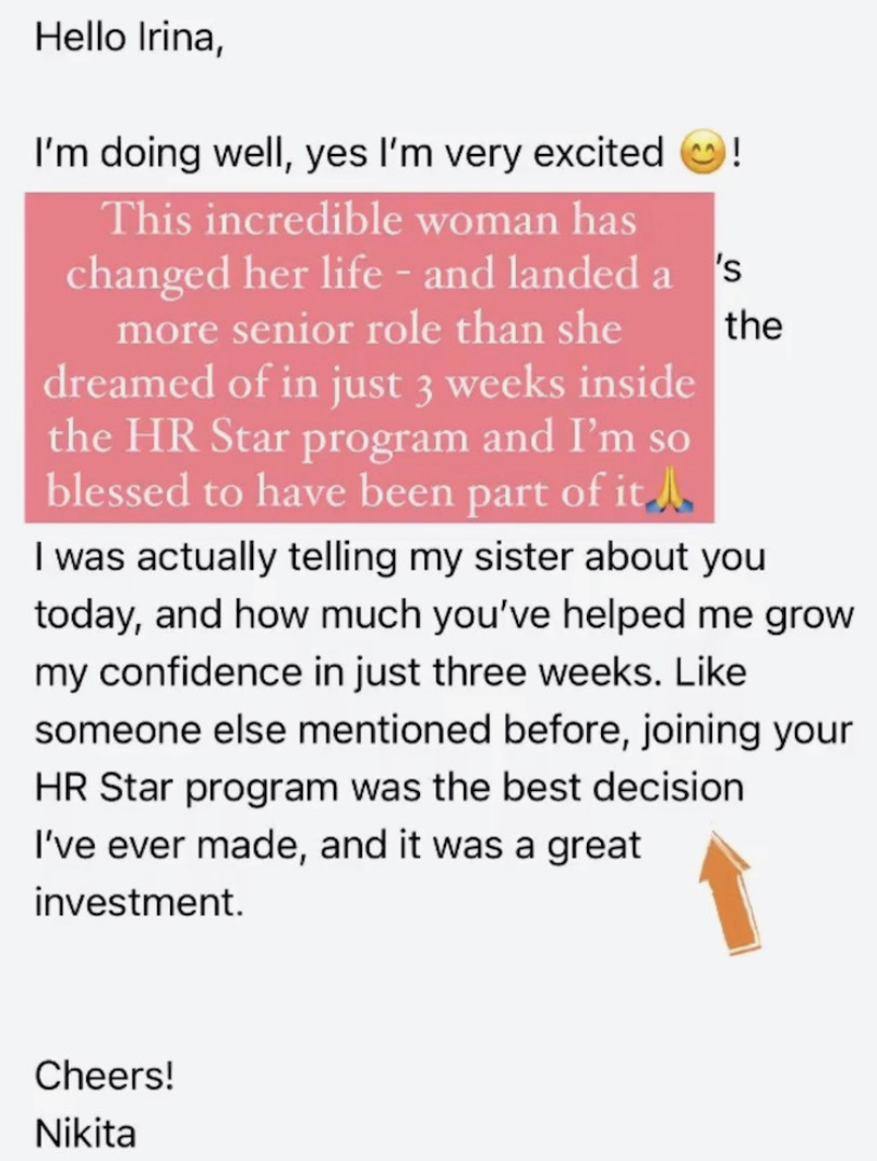 "I’m really thankful to you for giving me the confidence because I am brand new to HR, and my biggest challenge was getting my foot in the door. Thank you so much Irina!".